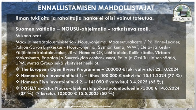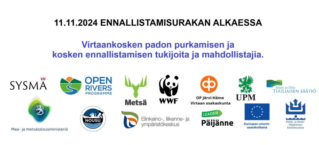 Maa- ja metsätalousministeriö, Maaseuturahasto / Päijänne-Leader, Pohjois-Savon Ely-keskus – Nousu-ohjelma, Sysmän kunta, WWF, Järvi-Hämeen OP/Virtaan osakaskunta, Raija ja Ossi Tuuliaisen säätiö, Metsä Group, Hämeen Ely-keskus / Maaseuturahasto, The European Open Rivers Programme sekä yksityiset henkilöt.