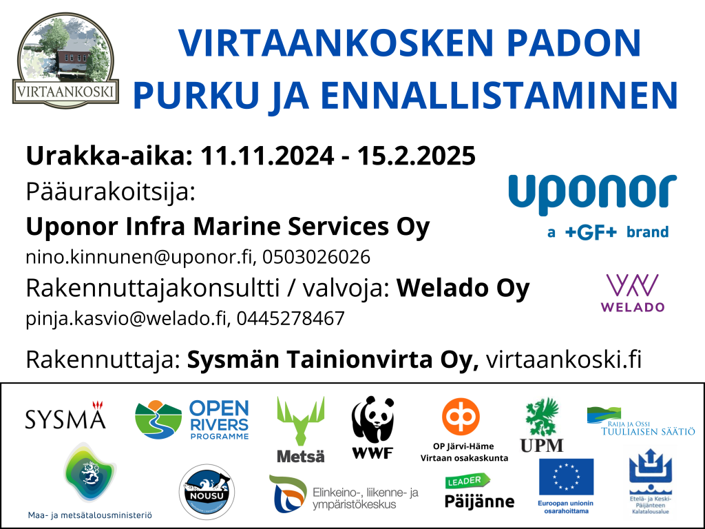 Urakan valmistelussa kaksi Päijänne-Leaderin -hanketta eli Vapaa Virtaankoski ja Vapaa Virtaankoski II -hankkeet ovat olleet avainasemassa ja keino tehdä urakan aloittamiseen vaadittavia valmistelevia toimenpiteitä, verkostoitumista sekä tiedotustoimintaa. Olemme kiitollisia tästä avusta, tuesta sekä luottamuksesta projektiamme kohtaan.